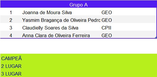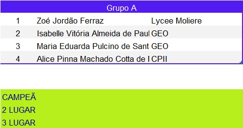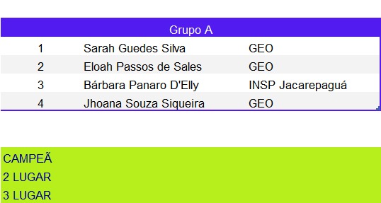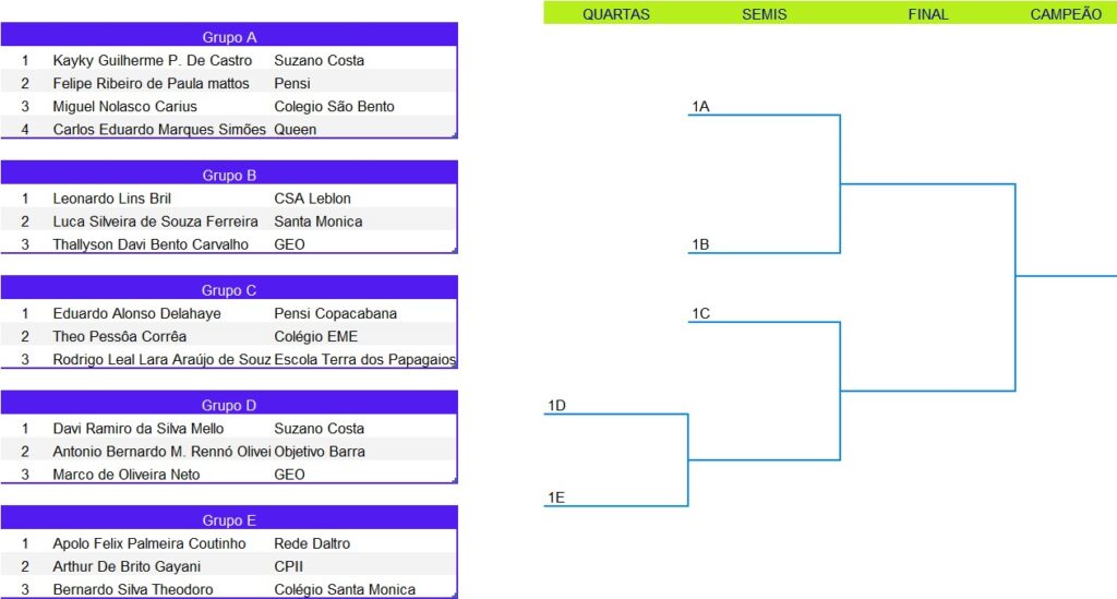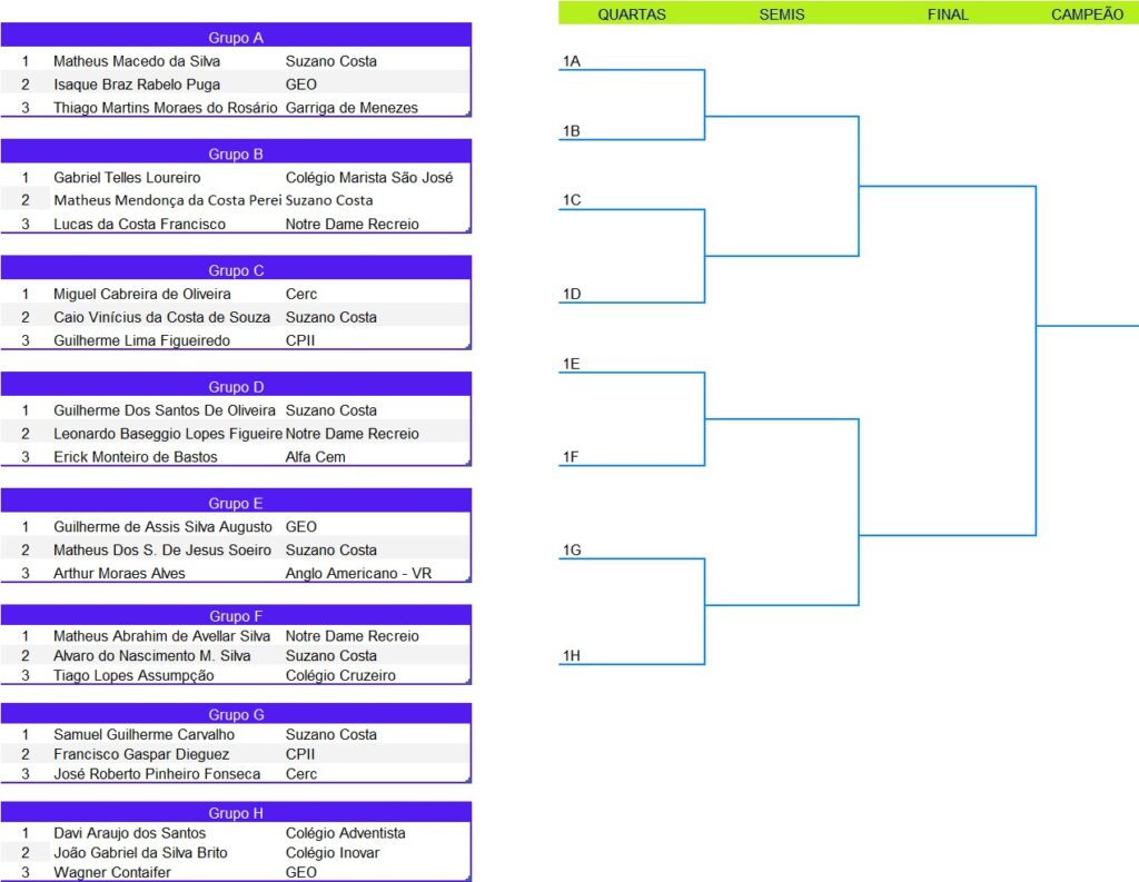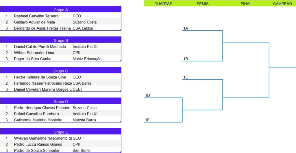 Tênis de Mesa – Chaveamento das Categorias 09:00 | 14 anos masculino 10:00 | 12 anos feminino 10:00 | 14 anos feminino 10:30 | 12 anos masculino 11:00 | 16 anos feminino 14:00 | 16 anos masculino 14:30 | 18 anos masculino Artigo anteriorUm dia histórico: estreia do Tênis de Mesa na Liga EscolarPróximo artigo Vem aí a 2ª Etapa da Natação